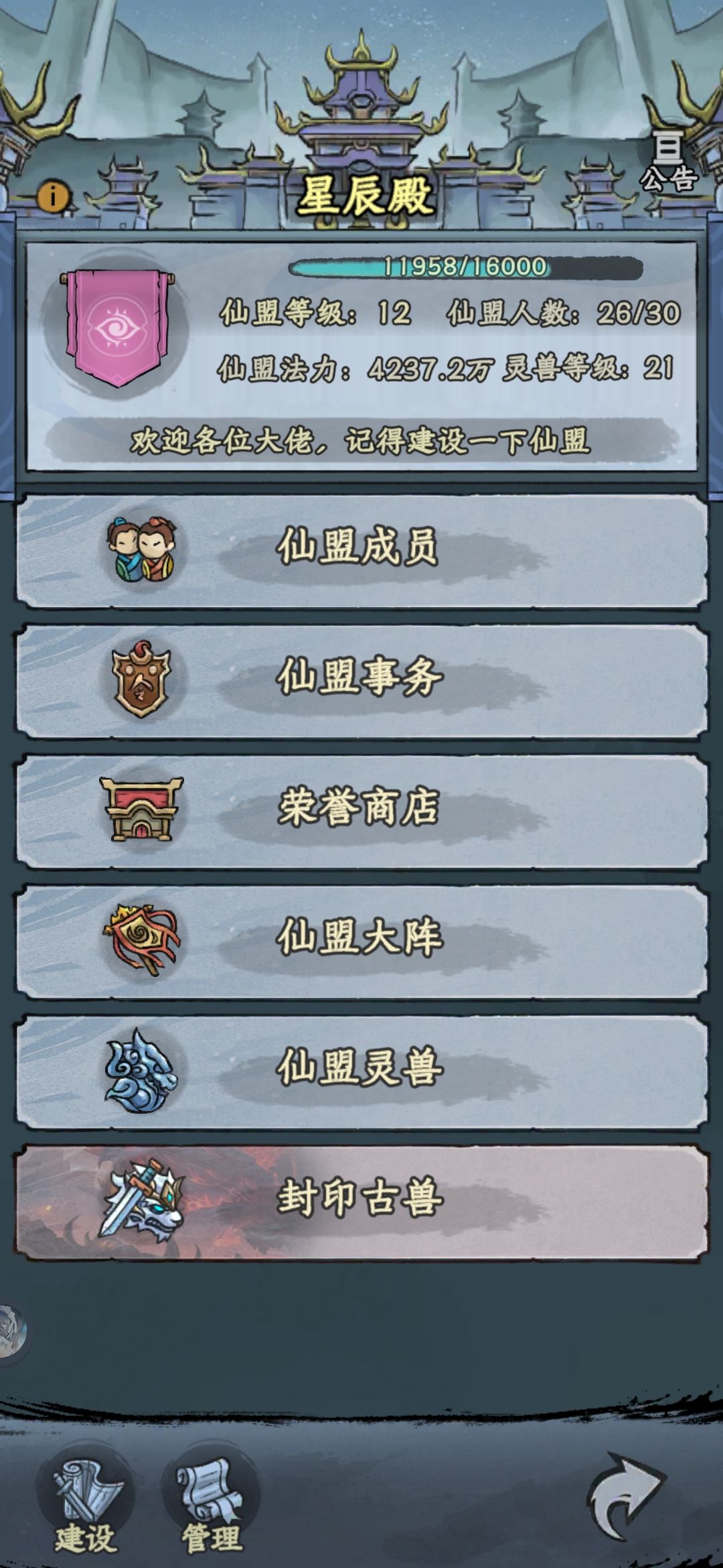 前言:仙盟需要结丹巅峰才能加入,创建需要300桃子,仙盟等级通过建设升级。只能加入同一个混沌的仙盟(当前混沌点击左侧更多-仙道混沌查看)。 一、仙盟基础 成员人数1级为25,每升2级增加一个位置,每升10级增加一个长老/主事位置。点击管理可以进行成员招募/权限设置/退出仙盟等。建设仙盟可以得到荣誉(第一次免费,后面每建设一次花费50/100/200桃……以此类推,每天刷新) 二、仙盟事务 分为白、