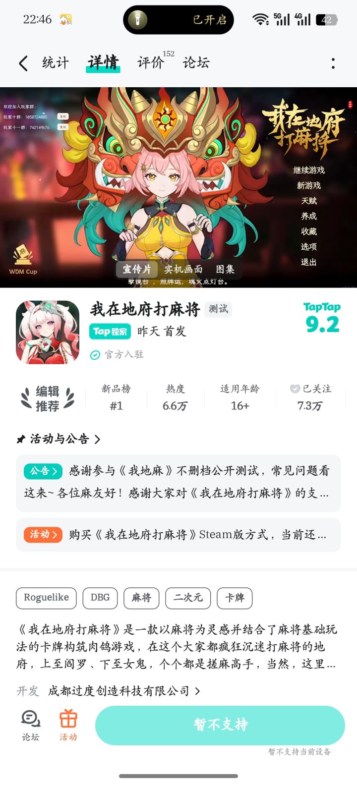 大家好啊,如果您感兴趣购买《我在地府打麻将》Steam完整版:可以在TapTap购买游戏Steam激活码:https://www.taptap.cn/app/743960?utm_medium=&utm_source=wechat_session&share_id=&os=pc进入页面后,切换到Steam选项卡,即可看到购买按钮。现在在Tap买key还可领取TapTap专属限时福利5元优惠