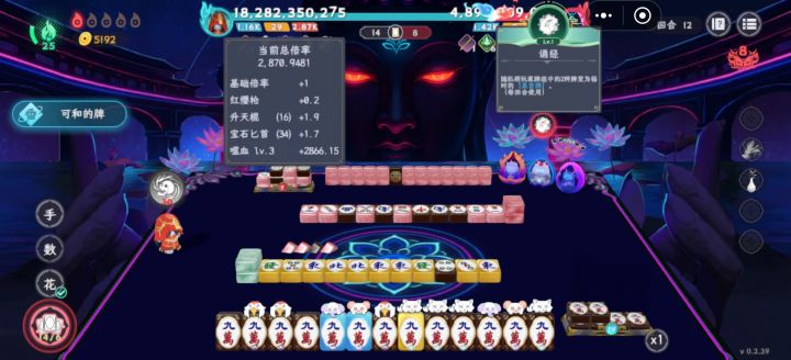 之前用马面打了好几次难度7都没打过,可能还是没研究好,但是用满宝一次就过了7和8 ,这几个灵俑太强了,靠吃,碰,杠,刷倍率,吃和碰完还能反回手牌,一直刷刷刷刷