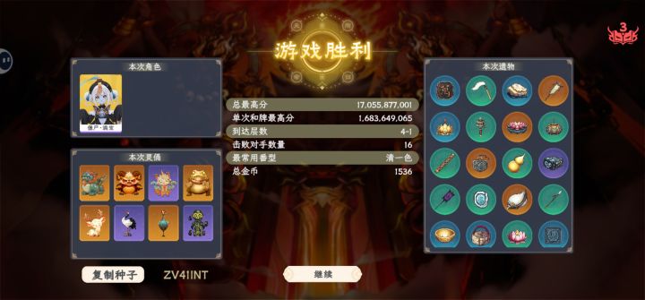 第一次用孟婆,直接打的难度8,感觉强度好高。运气不算特别好,前期没拿到叠倍率的灵俑,而且不知道孟婆奶茶技能和筒子有关,选做了条子,还有这个分数。就是手点的累。