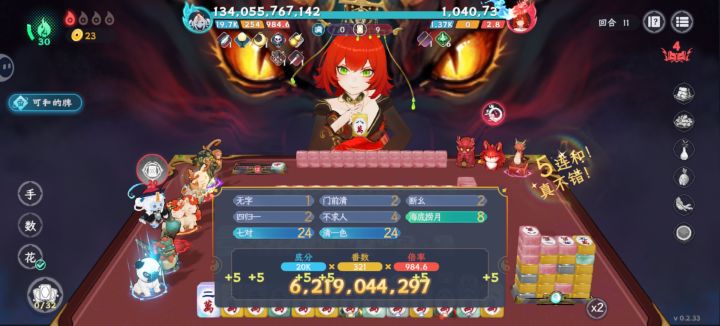 给大家说一下规则每回合摸4张,打4张总共可以摸40张牌和牌可以和4次,每次都计算分数40张牌摸完,最后计算双方的总分还有技能可以用,变牌之类的总之看起来挺有乐子的还有bgm,我在看番数牌型,突然听懂bgm唱的啥词儿