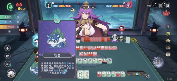 鬼新娘魅角色选到陆吾后可以正常触发吃牌涨被动的倍率,且显示底分增长。但该局麻将结束后陆吾增长的底分会被清零,下一局麻将又会从0底分开始(实测并不是显示错误,完全不生效)。从道具描述来看这个底分应该不是每局刷新才对。