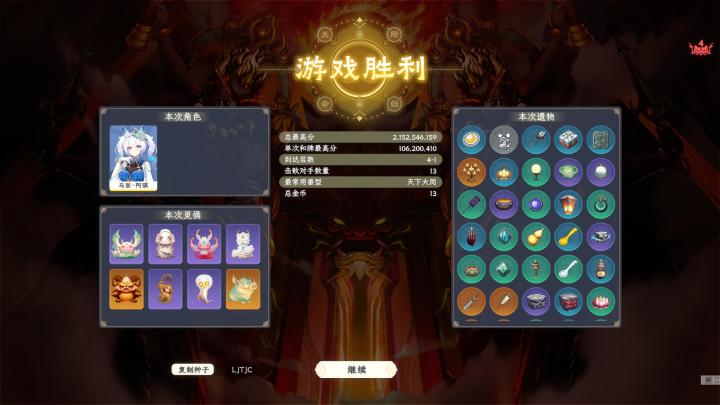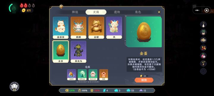 满宝前期太强势,导致忽略了没有倍率灵俑,和牌槽还只有7。差点通不了关。还好最后一关商店出的麒麟没卖出去,加上备用的凤凰蛋,送boss两条命刷麒麟倍率。最后凤凰蛋复活在商店又出了个当康,凤凰和当康救了我这个必败的残局简直刺激。