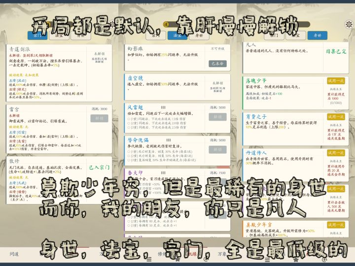 开局是一个个普普通通的凡人,门派直接是散修,法宝是最低级的法宝(拥有25%闪避率且无法升级),想要解锁身世还得看累计灵石获取量、以及通关修真等级期;那么游戏有什么提供开荒的点呢?有一点,比如说签到第二天解锁青莲剑派,用处仅仅是侧重于暴击(提供5%暴击率)、累计3下普攻可以必定暴击;签到第七天提供法宝虚空镜,拥有50%闪避率且无法升级。