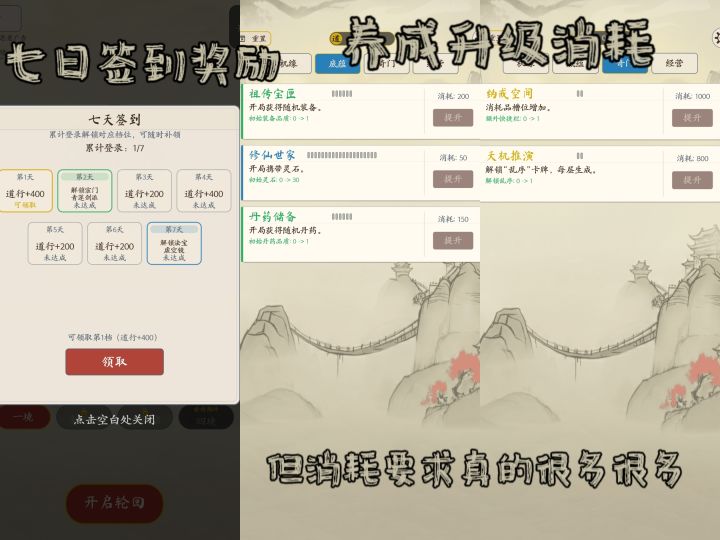 真的,给人气笑了,开荒就是坐牢,坐牢完七天继续坐牢,全靠不断刷道行、来缓慢提升场外养成(第二点会说)。