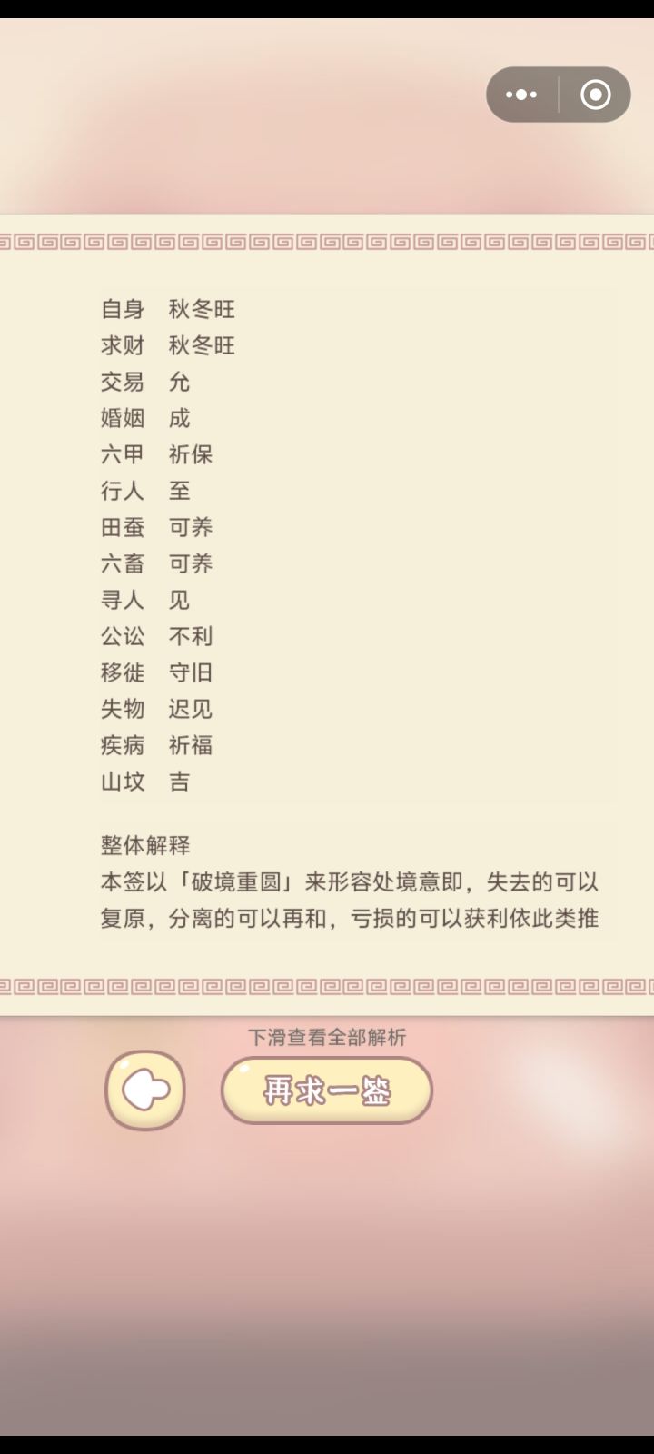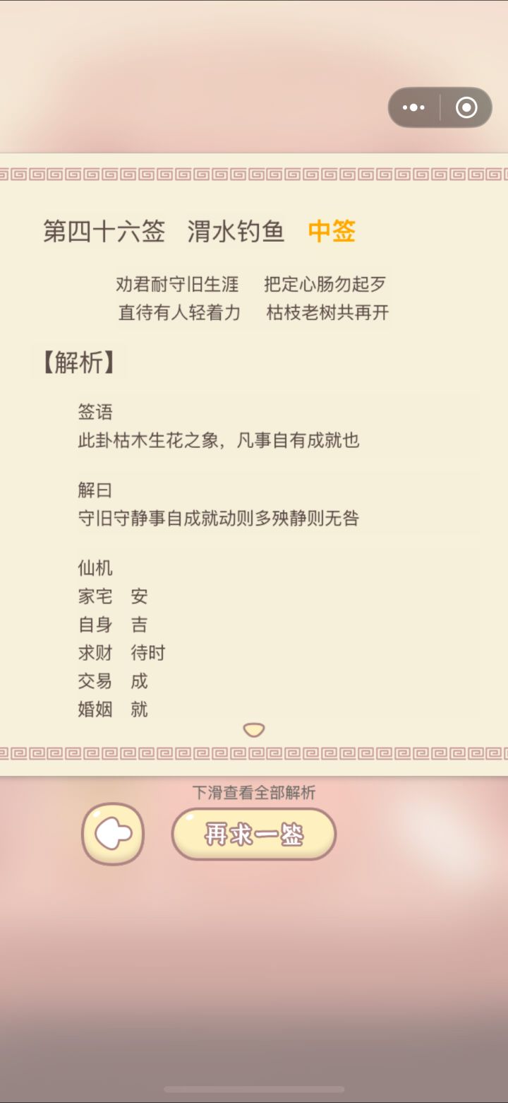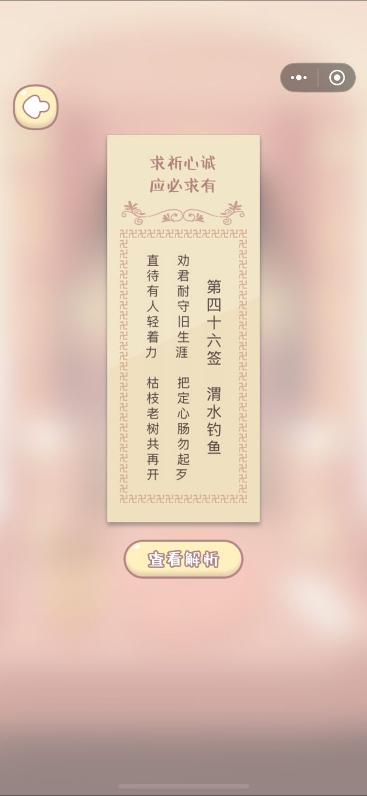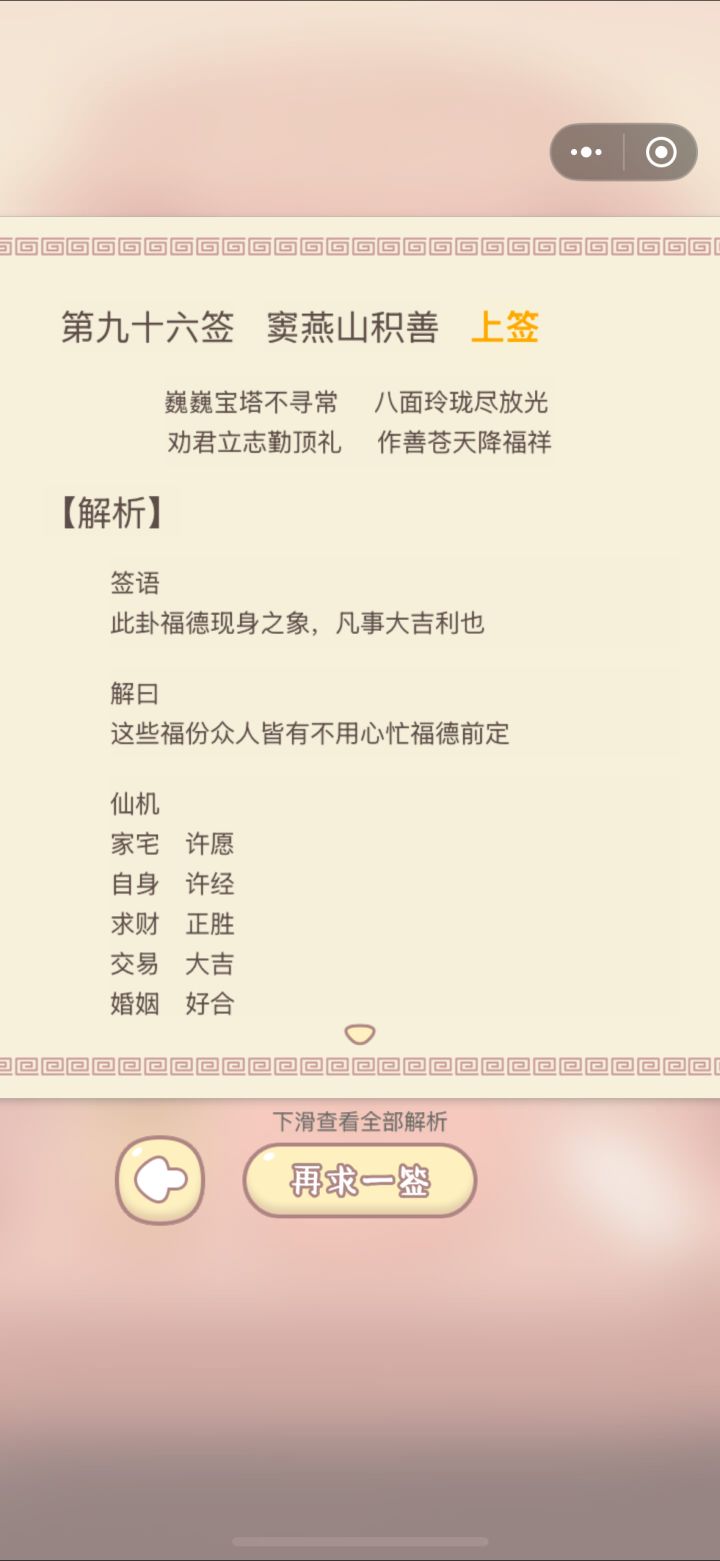 与其说是个游戏,不如看成是一款日历软件。有比较详细的新手引导操作,上手不难。主要功能是拜仙和看气运两个,前者需要设定一系列复杂的部件设定,包括供品、烛台、香等多种道具,界面左下还可以敲木鱼增加功德值,就跟电子木鱼的功能一样。看气运总计六种,每一种一天只能看一次,只有连续三次圣品才能解签获得文本信息,能否连续圣品非常看脸,建议洗把脸再抽。