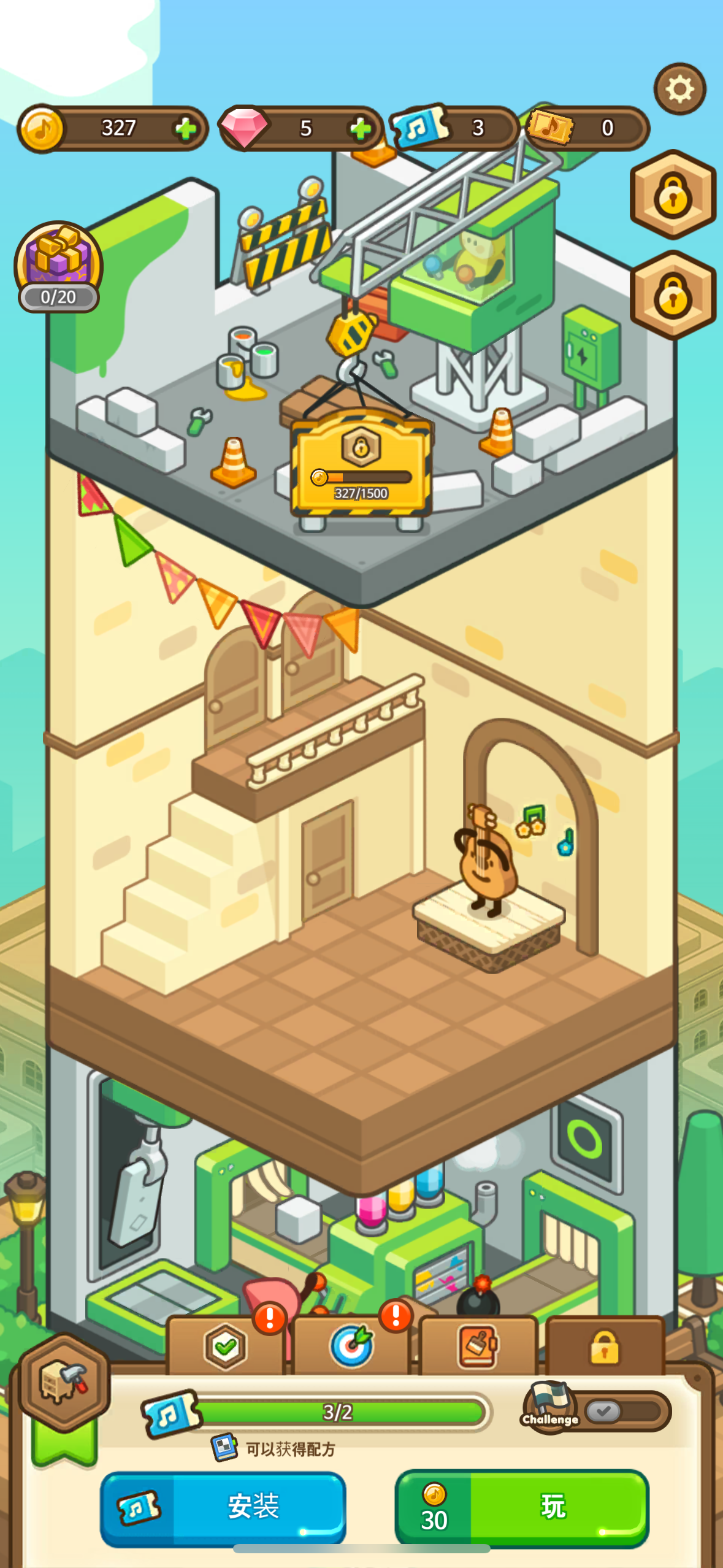 玩音游获得音乐券,用来装修房屋,和很多轻度游戏的设定很接近,室内部件二选一,需要一定安装时间,可以使用钻石跳过等待。任务产出的道具还可以制作琴键和背景,种类很丰富。