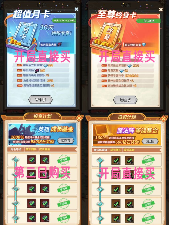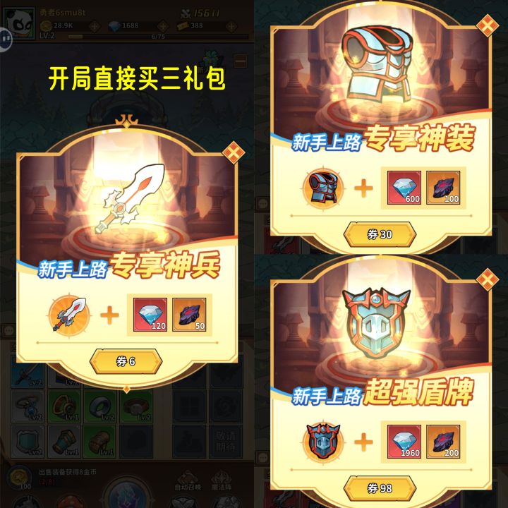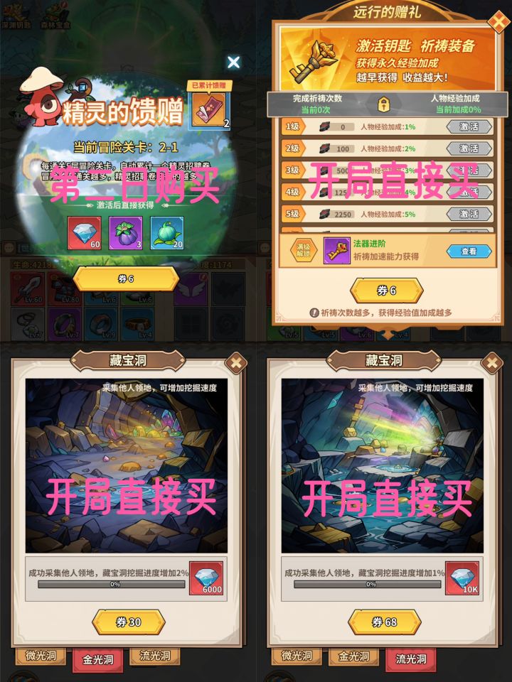 新手点券分配游戏每日可观看广告获取150点券,进群新人礼包码JYJL12388,第一日可获取538点券(因为每日获取有限,优先选择功能类礼包,月卡,永久卡,成长基金,新手礼包前三个,深渊钥匙,宝藏洞两个礼包(领地左下角)共计534点卷,第二日购买精灵的馈赠6,英雄成长基金98。关于开箱子:尽可能的升级魔法阵,魔法阵可解锁精灵位置,前期可酌情多买一些时间加速和金币,每多上阵一个精灵(将精灵升级