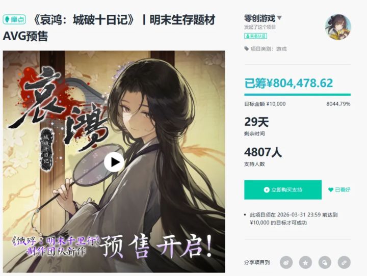 明末生存题材文字冒险游戏《哀鸿:城破十日记》即将发售! 该游戏是《饿殍:明末千里行》制作组零创游戏开发的同系列第二部作品。 目前定档于2026年4月5日清明节发售,定价42元,首周-15%折扣仅售35.7元,并且可与百万销量好评如潮系列作《饿殍:明末千里行》捆绑打折! “十年士妓之恋,十日生死逃生。” “根据《扬州十日记》改编,还原真实历史。” “一六四五年,改朝换代之际,你将扮演一名书生,在战乱