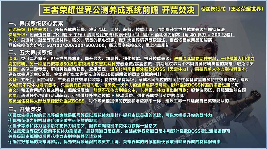 没看前瞻直播的新手兄弟看过来!整理了所有新手必知的重点,帮你快速了解游戏,公测不慌~ 1. 上线时间:PC端4.10公测,移动端四月内上线,现在可以提前预约,领取首发福利 2. 核心玩法:开放世界探索(攀爬、游泳、跑酷)+ 唤灵协战(召唤野怪协同)+ 四人组队BOSS战,还有英雄技能实景还原 3. 养成重点:取消随机铭文,装备可分解重铸,等级体系简化,新手入门无压力,赛季末有追赶活动 4. 核心场