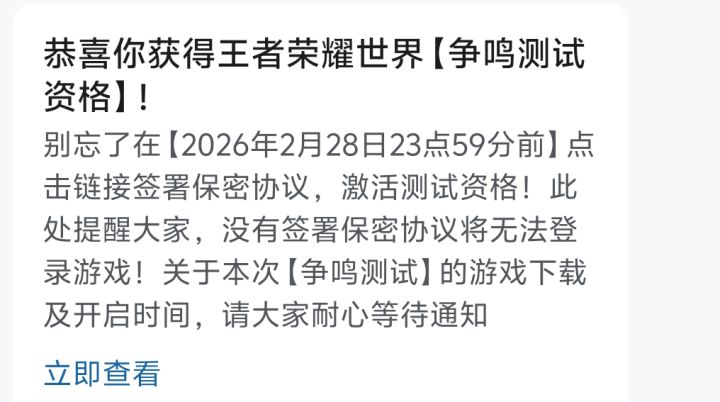 亲爱的元流之子,争鸣测试预下载已于3月4日 17:00开启,正式开测时间为3月5日 12:00。如您在预下载过程中遇见问题,请查看《争鸣测试预下载常见问题FAQ》。感谢您的理解和支持。本次测试为邀请测试,仅获得资格的玩家可以下载体验,感谢大家的理解与支持!#王者荣耀世界定档4月 #王者荣耀世界 【测试信息】测试预下载时间:3月4日17:00测试预计开启时间:3月5日12:00测试类型:本