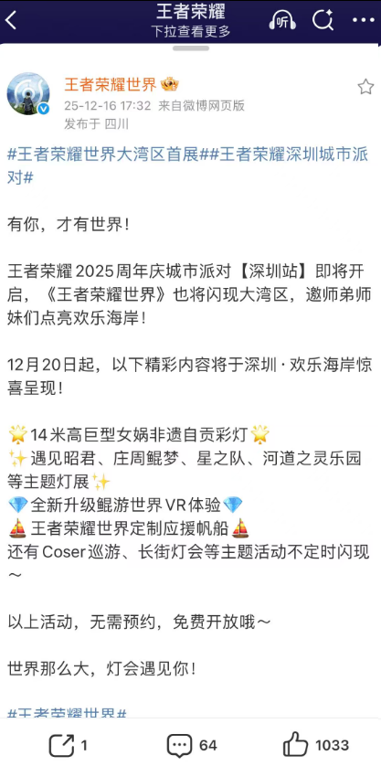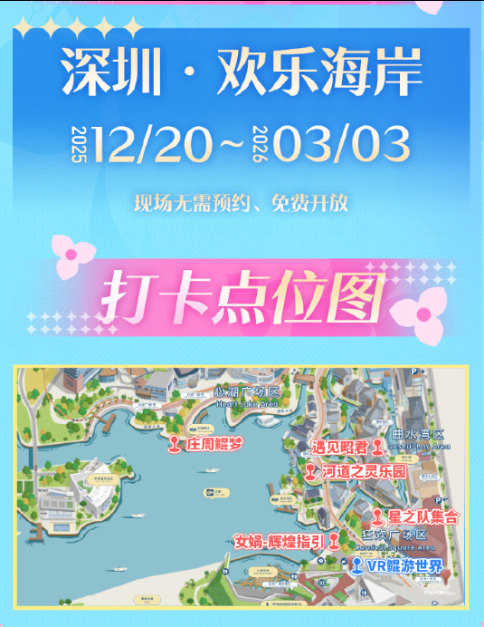 有你,才有世界!王者荣耀2025周年庆城市派对【深圳站】即将开启,《王者荣耀世界》也将闪现大湾区,邀师弟师妹们点亮欢乐海岸!12月20日起,以下精彩内容将于深圳·欢乐海岸惊喜呈现!🌟14米高巨型女娲非遗自贡彩灯🌟✨遇见昭君、庄周鲲梦、星之队、河道之灵乐园等主题灯展✨💎全新升级鲲游世界VR体验💎⛵️王者荣耀世界定制应援帆船⛵️还有Coser巡游、长街灯会等主题活动不定时闪现~以上活动