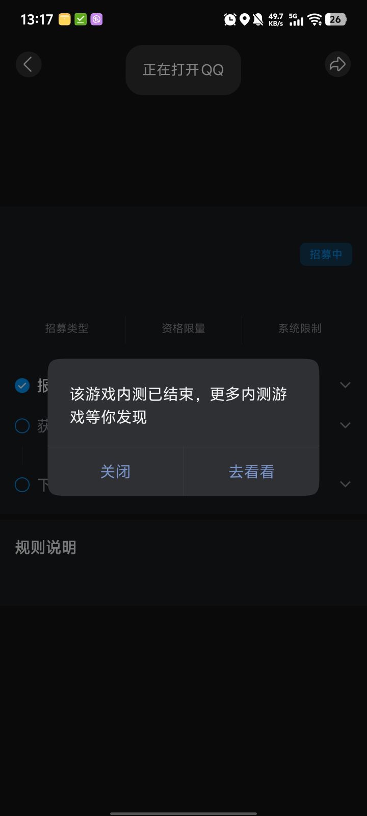 打开QQ,搜索游戏中心-试玩-我的申请如果有资格会显示“已获取资格”然后点进去,要把“报名条件”下面3个全部勾选