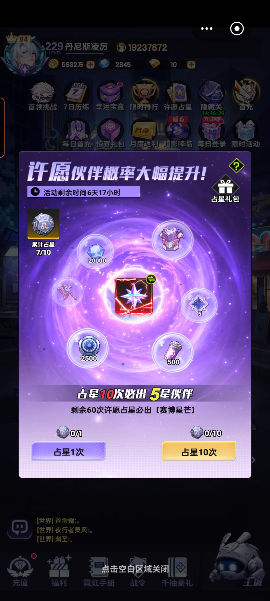 许愿就不说了,看运气,不过我看好像概率设置的挺高,我们算了一下你激斗按最好位置算每分钟3*3+4=13,500000/13/24/60=26.70940171,你还要准时收菜还要一直占最好位置。 月度返里的话那个掠夺每天24次,24*30=720也就是说可以搞700次的奖励,如果那个没有上限应该是一个月能拿2800个材料将近三个赛博星芒,每天可以买10次34*30=1020没有上限的情况下就是5
