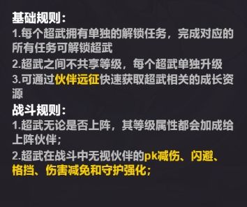 基础规则:1.每个超武拥有单独的解锁任务,完成对应的所有任务可解锁超武2.超武之间不共享等级,每个超武单独升级3.可通过伙伴远征快速获取超武相关的成长资源战斗规则:1. 超武无论是否上阵,其等级属性都会加成给上阵伙伴;2. 超武在战斗中无视伙伴的pk减伤、闪避、格挡、伤害减免和守护强化;超武进化:1.每种超级武器拥有6个天赋技能,初始解锁一个天赋技能,其他天赋技能需要消耗相关材料