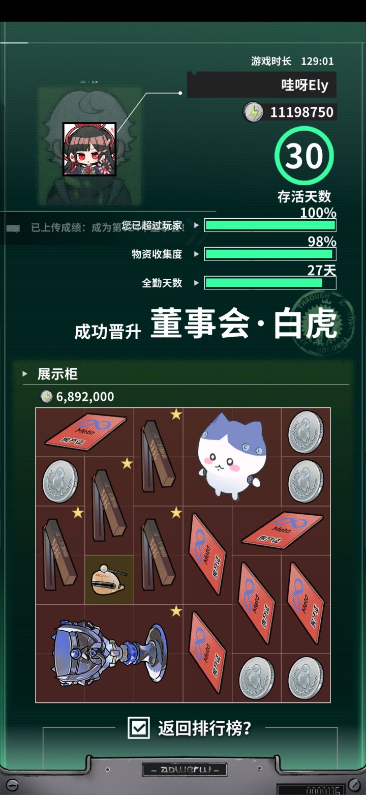 这游戏的⚠️核心应该是皮肤方面,可进行皮肤点数排行,皮肤最低为C级,最高为SSS级。皮肤抽取中目前共有4种皮肤,5000皮肤币一抽;董事兑换(原皮)中10董事币一抽。两个皮肤即可进行合成,完全看脸(我脸很黑,用A+A,A+S,S+S等合了很多次得到的都是更差的或居中皮,唯一一个3S反而是A+C无意中合成的)。低级皮肤可以重铸换重铸币,也可搏一下单车变绵羊😃此外,游戏还有职位,最高为董事,分为四个等级:玄武→朱雀→白虎→青龙,每升一级多5个董事币,最高25个。董事等级对应你赚的钱,最低为500万,最高两千万(青龙),每级相差500万。每天还可以瓜分皮肤币(最高8万多),职位越高占股越多。