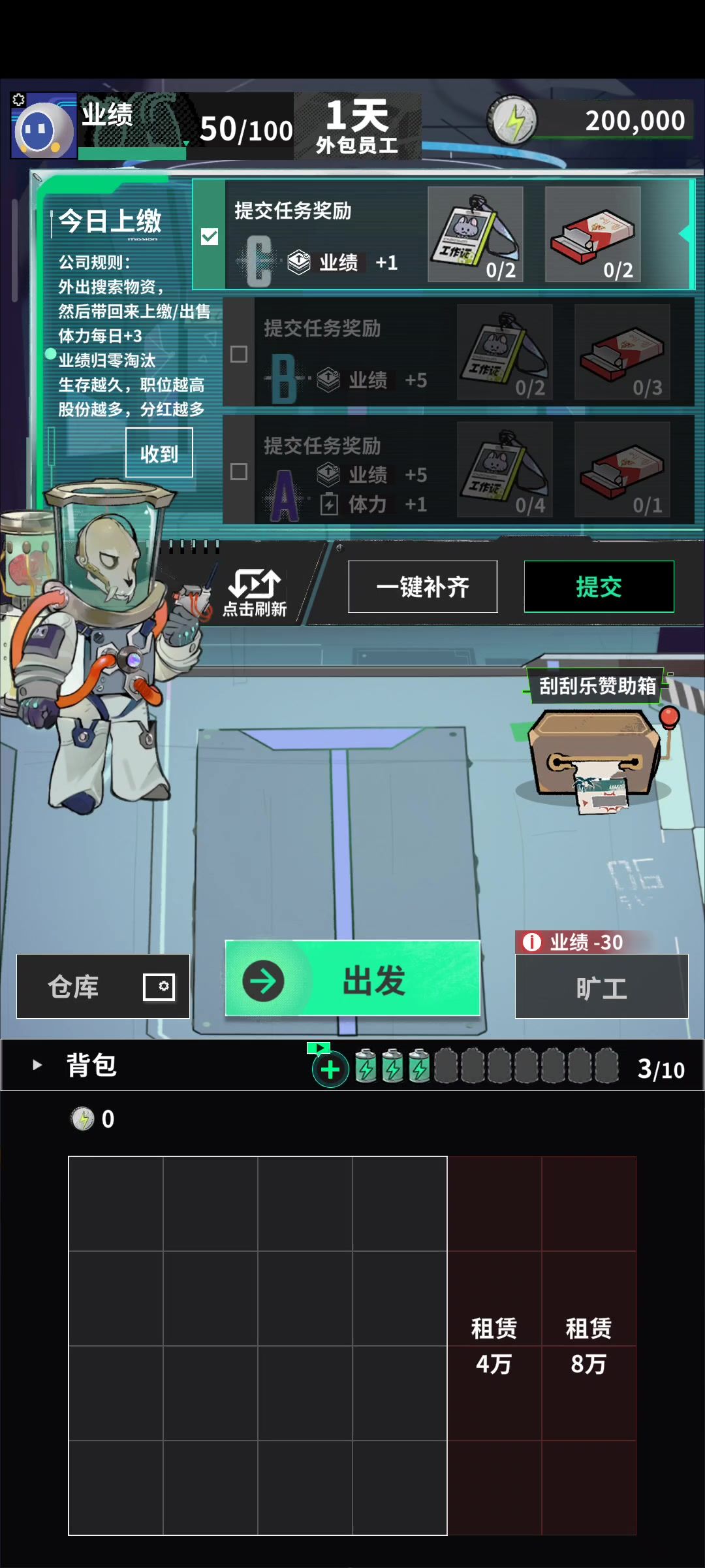 终于到董事会了,一篇入门指南,希望可以帮到大家。 1.先简单说下玩法,一句话概括:搜集物资,完成每日任务,活够三十天。 之所以选择这款小游戏而没有去玩三角洲,主要是本人手残党,玩和平精英是快递型选手,如果你也和我一样,那么这款游戏就很适合上手。 2.接下来我们一起进入游戏,可以看第二张图片 这里主要是两个部分 第一,公司任务,分为A、B、C三个类型 这个部分的理解很重要,这里有两个奖励,“业绩”和