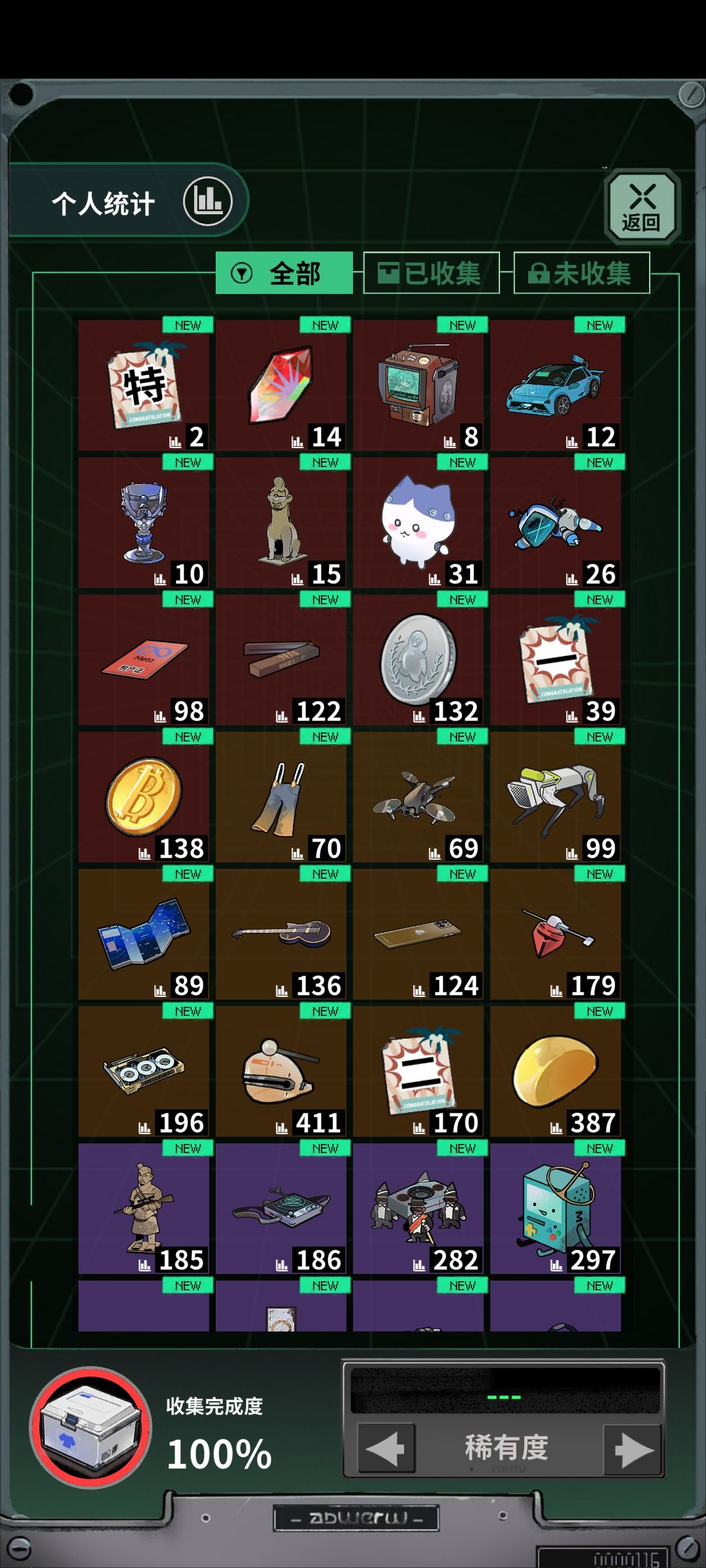 首先我们要明白,我们的背包最低可以收纳16格物品,后续可以通过支付租金来额外获得4/8格的背包储存,也就是说我们最大拥有的背包是24格如图所示: 野外的物资取之不尽用之不竭,而我们的背包有限,所以我们需要通过自我感觉后判断同等量级情况下该先将什么物品放进背包或展架以获得最大收益。 首先说结论:无论任何情况下,优先选择稀有度高的物品放入背包,如放不下可考虑用其他品种填满背包,另外本章所有计算均为单格