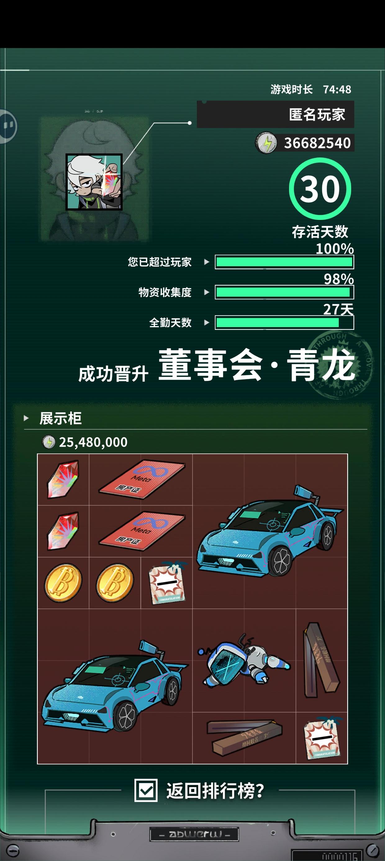 开局进地图,如果出了广告红箱就直接选去红箱的路线(我估计不会有红箱,我刷了十几次都没见到)如果没有就进去随便拿东西,出来把东西全卖了,把A级任务补齐,再进第二天。之后看有没有红箱,没有就随便拿东西,再出来卖了补齐任务,然后接着下一天,一直重复到刷出红箱为止(大概第三或第四天会出)如果没出最欧或者最非就直接重开⚠️(点左上角头像之后见图二右下角有重开一局,我估计很多人都不知道还能重开,顺便提一嘴