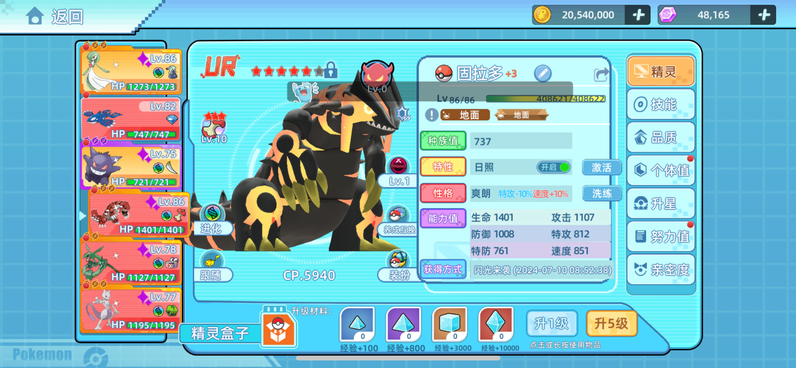 固拉多是地面属性的强力物攻手,原始回归后变为地+火属性且实力大增,核心围绕物攻输出与晴天天气优势培养,原始形态还能玩特攻冷门玩法,具体攻略如下:1. 性格选择:常规物攻流优先固执,最大化提升物攻;想补速度短板可选爽朗。特攻冷门玩法若走顺风体系选胆小,空间体系则适配加HP的内敛类性格。2. 携带道具:常规带吃剩的东西,保证持续续航;追求爆发可选生命宝珠,提升技能威力但会消耗自身HP。原始回归形态
