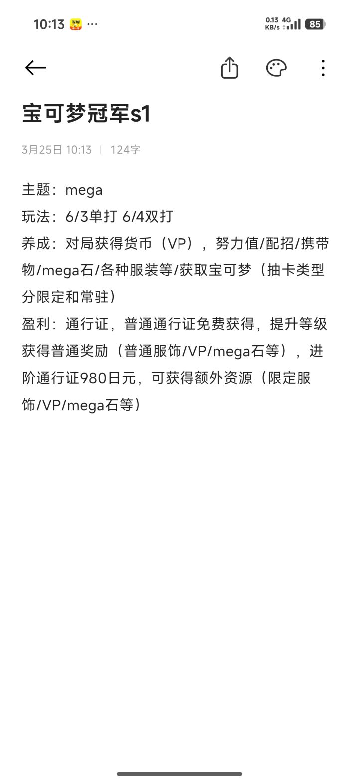 最近被《宝可梦冠军》疯狂刷屏,玩了几天我只想说,它简直是宝可梦系列对战玩法的集大成之作,对战党千万别错过! 🎮 玩法创新,策略拉满 游戏主打对战,在传统回合制基础上大升级。“冠军挑战”杯赛太刺激了,限时少回合取胜,逼得我疯狂钻研战术,每局都全神贯注。宝可梦属性、特性、招式搭配超丰富,还回归了超级进化 ,引入太晶化,对战策略直接多到爆炸💥 想赢不仅要靠宝可梦练度,更要考验临场应变和战术规划,烧脑