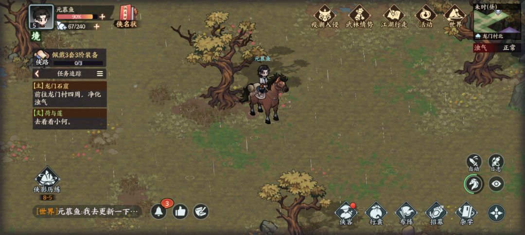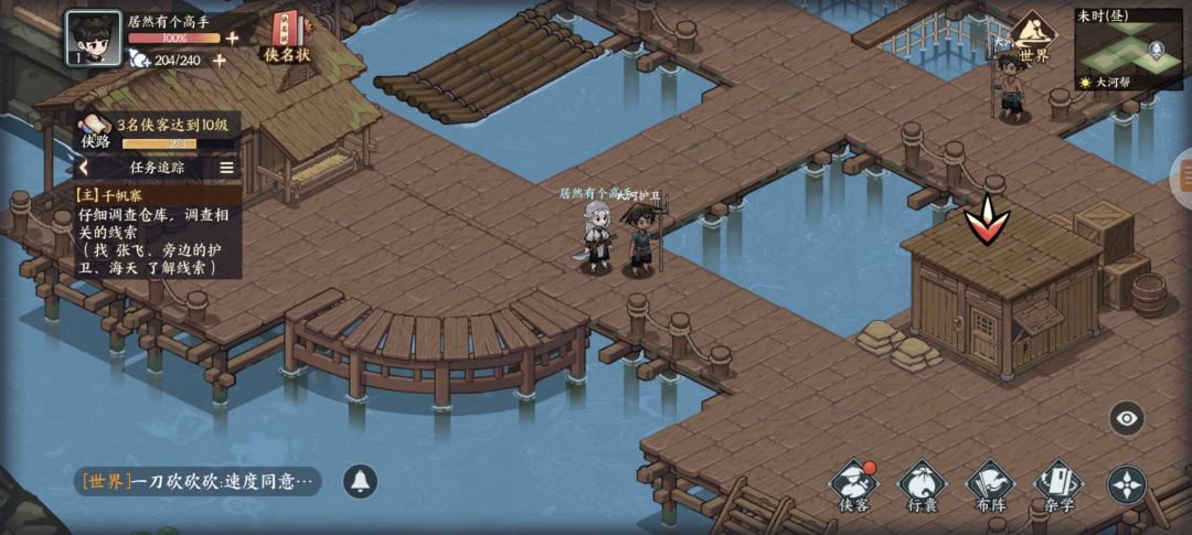 七侠镇:买鱼饵,开锁工具,打武教管事,坐骑口粮(正式服应该还需要去客栈买酒喝) 将军渡:将军渡采集甘草-树莓 大河帮:1.大河帮找东舵主李涛练鲸吸功,护送&劫船,贡献商人买鱼饵。2.黑鱼滩采集树莓-芦苇。3.渔歌村买鱼饵,采集铁矿。 野狼林:1.牛家村采集井水-树莓。2.牛首山采集精铁矿-蜂蜜,打熊王。3.野狼林西采集人参-松树-甘草。4.野狼林打狼王,采集松树-当归。5.野狼林北采集金银花