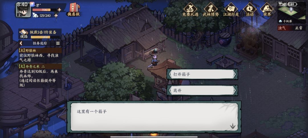 (所有的采集均需浊气正常才可以,采集物也没有坐标显示,就算有图可能也得各位自己划拉地图寻找,往后不再赘述) 两个采集点:甘草,树莓。第一个宝箱里拿铲子路上挖土堆得到士兵旧剑。跟着主线完成后先不去七侠镇,先回将军渡把资源采集了进入将军墓后往左上方发现机关,把旧剑嵌入后发现秘密宝箱,内有轻功掠风决,将军渡探索度完结获得斗笠外观。