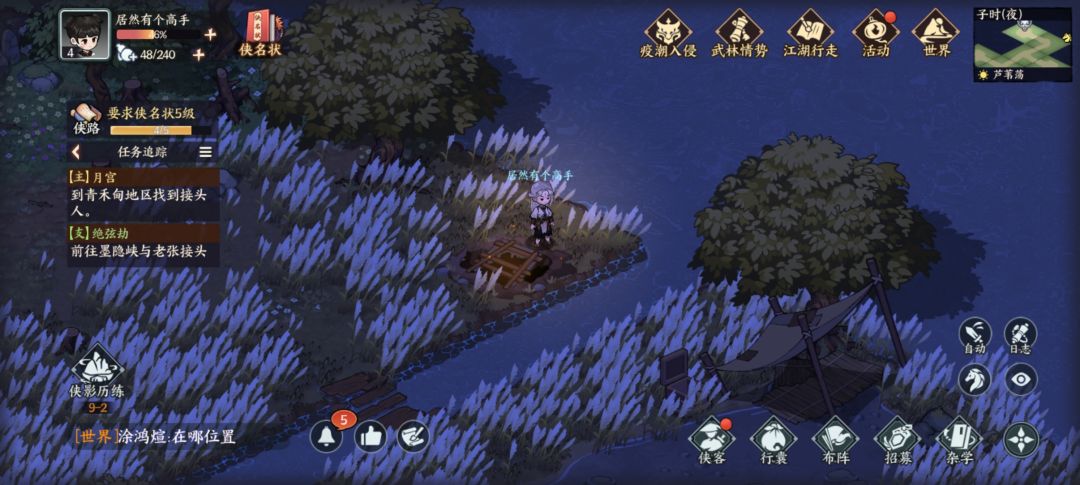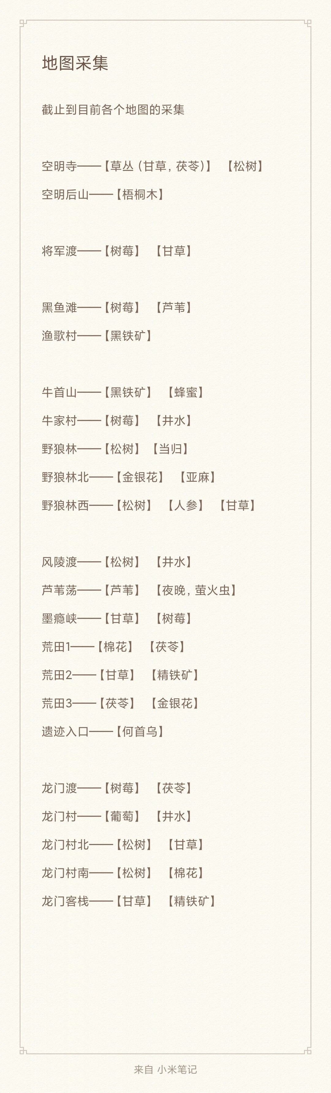 (所有的采集均需浊气正常才可以,采集物也没有坐标显示,就算有图可能也得各位自己划拉地图寻找,往后不再赘述) 两个采集点:甘草,树莓。第一个宝箱里拿铲子路上挖土堆得到士兵旧剑。跟着主线完成后先不去七侠镇,先回将军渡把资源采集了进入将军墓后往左上方发现机关,把旧剑嵌入后发现秘密宝箱,内有轻功掠风决,将军渡探索度完结获得斗笠外观。