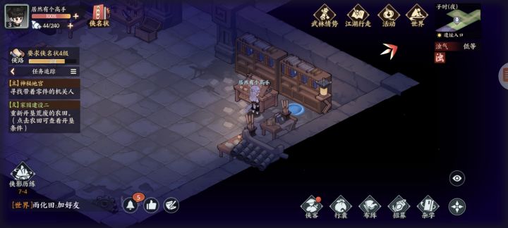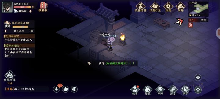 风陵渡采集点-松树-井水,绘画点-客栈右边荒田1采集点-茯苓-棉花荒田2采集点-甘草-精铁矿荒田3采集点-茯苓-金银花墨隐峡采集点-甘草-树莓芦苇荡采集点-芦苇(左上角)-萤火虫(夜),绘画点1古墓入口遗迹入口-何首乌月宫1绘画点-进入没几步探查(绘画完也是芦苇荡的)墨家遗迹:杂货买几个火折子(地宫里有一些地下或者墙上可以按下去的机关注意)图1探查得三角零件,图2开石门,图3得方形