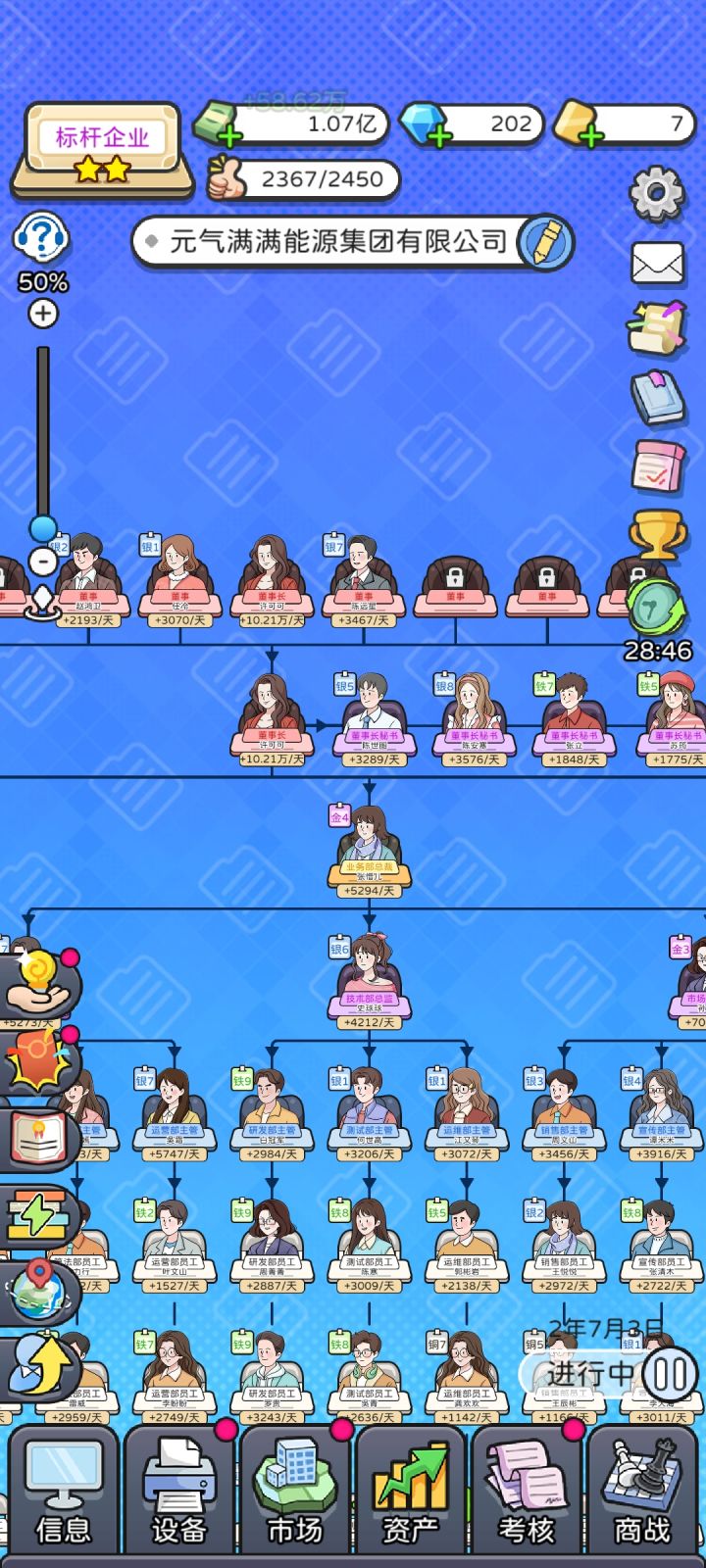 9部门每个8项,一个部门升满10.7787亿,所有部门97.00848亿。前期只需要升级业务部,中期升董事长,整体来说就是提供爽感,后期拉满。