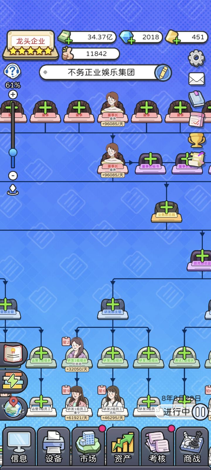 轻度放置模拟经营类游戏,是对于公司组织架构的一种模拟,每个员工都有赚钱能力、工作经验、事业心等属性设定,有一定随机数。不考虑赔钱等运营元素,只看赚钱生产力,开启时间流动后资源会自动产出,手动点击控制养成即可。新手引导流程比较短,可以很快进入自由操作阶段。
