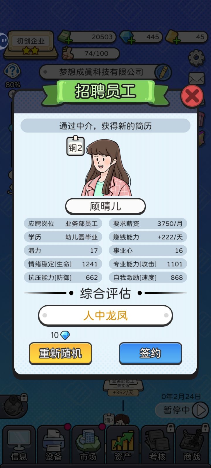 人员通过定期招聘获得,品质按照绿蓝紫橙随机,可以用钻石重新刷随机值。已入职的员工可以提供收益,并随着时间流动提升职级、事业心等属性,无需玩家手动操作,只需决定事件选择即可。