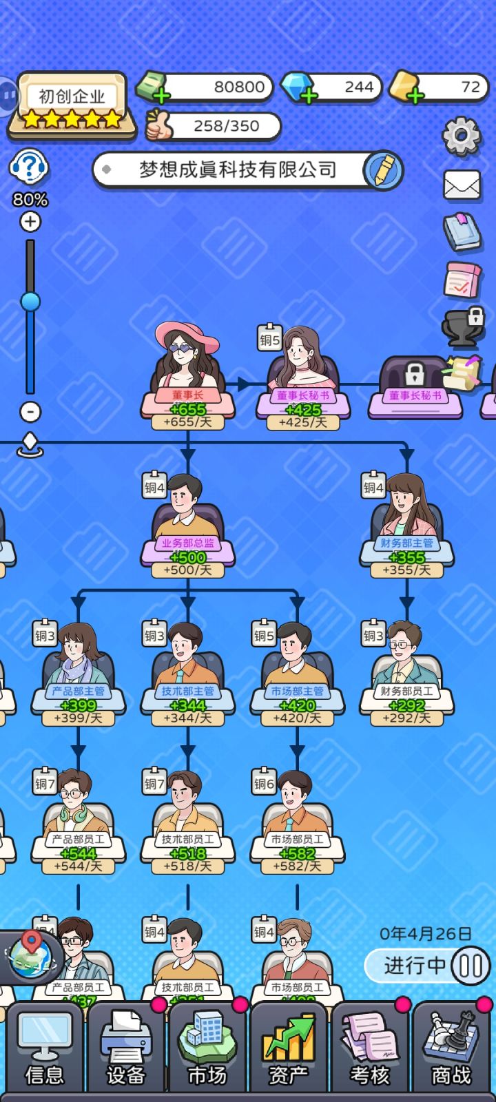 资产可以为所有员工提供属性增益,比如班车、秘书住房等,通过人数上限解锁,升级节奏比较慢,一般操作量很少。