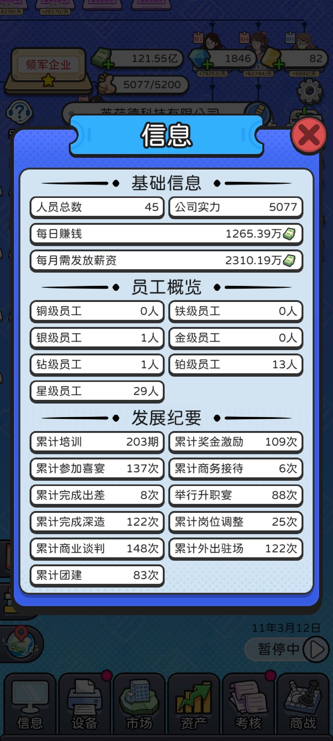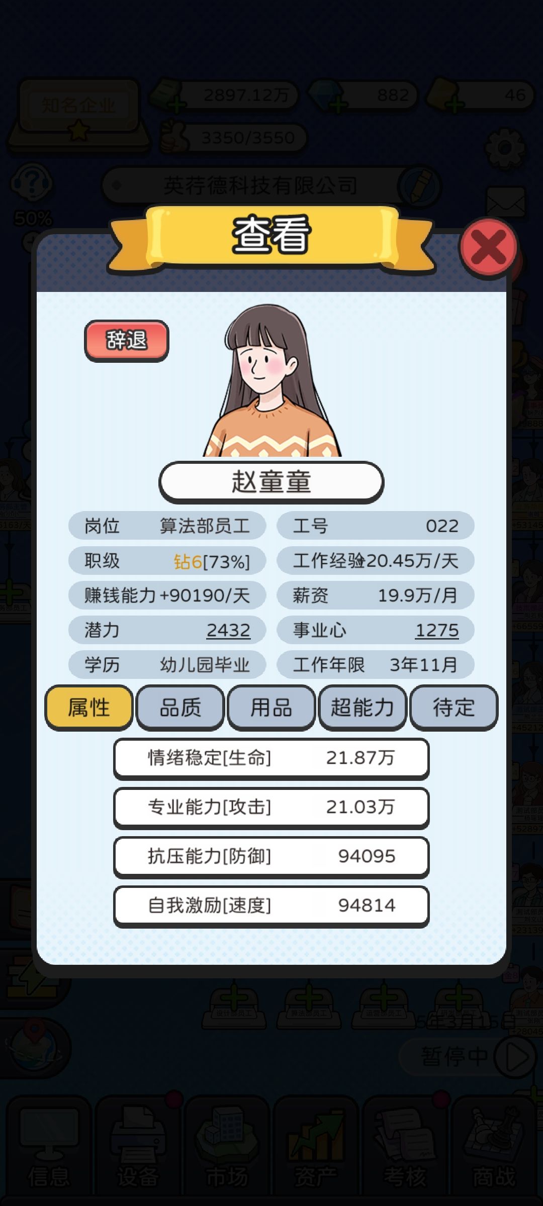 少养点人,我个人推荐就主要养业务部门下,人数到40左右就OK,前期还可以卡一下18人什么的,其它部门就出一个头头好了。 金币只强化业务部,不用看广告,金币很快就完全没用了; 钻石由于基本不招人,也不用刷属性,考核和市场开到能把手头的人全装下去就行,由于压了总人数,并不需要开太多,大部分时间刷商战就够用,偶尔只看看来救急; 金卡成了全场MVP,多看,爱看,喂大毋须多宴。 如果要对公司等级比较有追求,