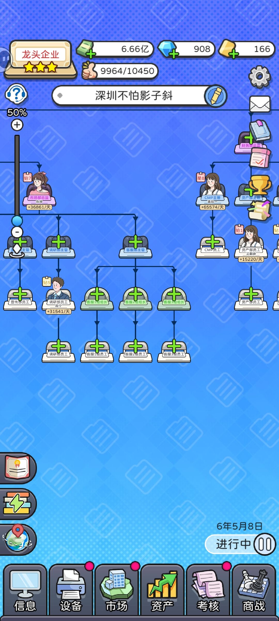少养点人,我个人推荐就主要养业务部门下,人数到40左右就OK,前期还可以卡一下18人什么的,其它部门就出一个头头好了。 金币只强化业务部,不用看广告,金币很快就完全没用了; 钻石由于基本不招人,也不用刷属性,考核和市场开到能把手头的人全装下去就行,由于压了总人数,并不需要开太多,大部分时间刷商战就够用,偶尔只看看来救急; 金卡成了全场MVP,多看,爱看,喂大毋须多宴。 如果要对公司等级比较有追求,