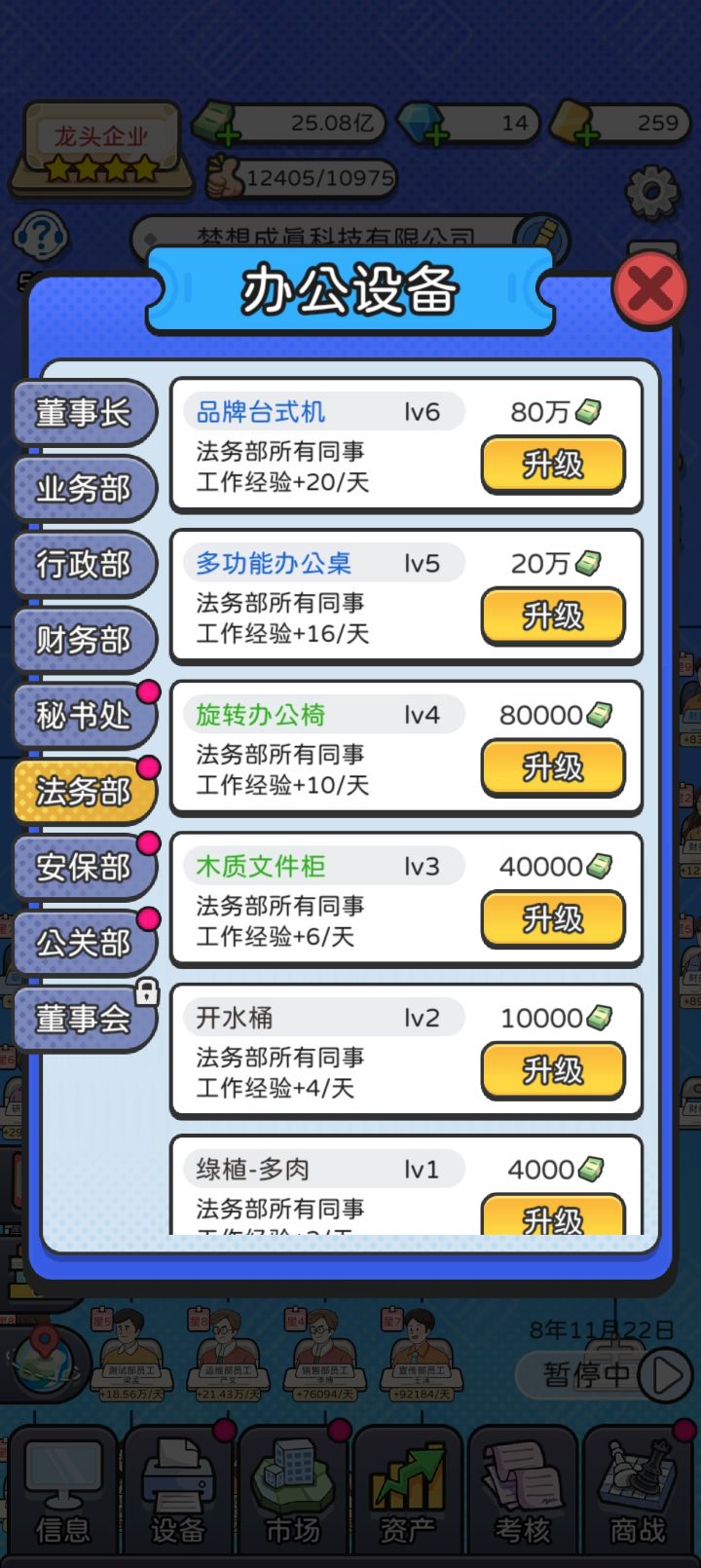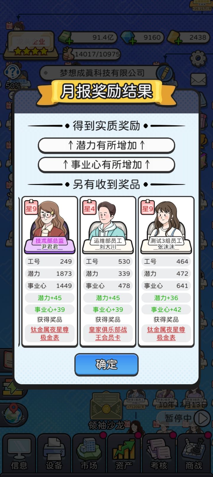 少养点人,我个人推荐就主要养业务部门下,人数到40左右就OK,前期还可以卡一下18人什么的,其它部门就出一个头头好了。金币只强化业务部,不用看广告,金币很快就完全没用了;钻石由于基本不招人,也不用刷属性,考核和市场开到能把手头的人全装下去就行,由于压了总人数,并不需要开太多,大部分时间刷商战就够用,偶尔只看看来救急;金卡成了全场MVP,多看,爱看,喂大毋须多宴。如果要对公司等级比较有追求,