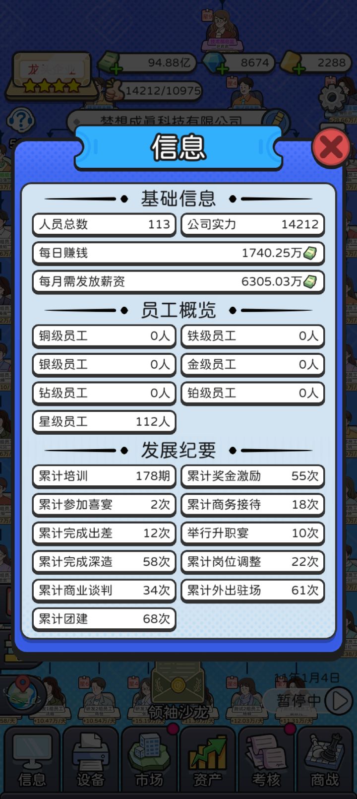 先介绍所有功能:商战⭐⭐⭐⭐⭐⭐两个400万就可以通关,其余一刀死抗下就行。伤害会有强制1血,所以理论上防御高的一个500万也能通关。算是前期灵魂,额外加两星。为啥到不了后期,源于这个游戏最恶心的机制【公司人数越多,游戏内每天时间对应现实时间时间越长,比如5人1s,10人1.4秒,15人1.8秒,20人2.2秒,30人2.6秒,50人3.7秒……以此类推,也就导致了这个游戏我百人百星就没玩了,时