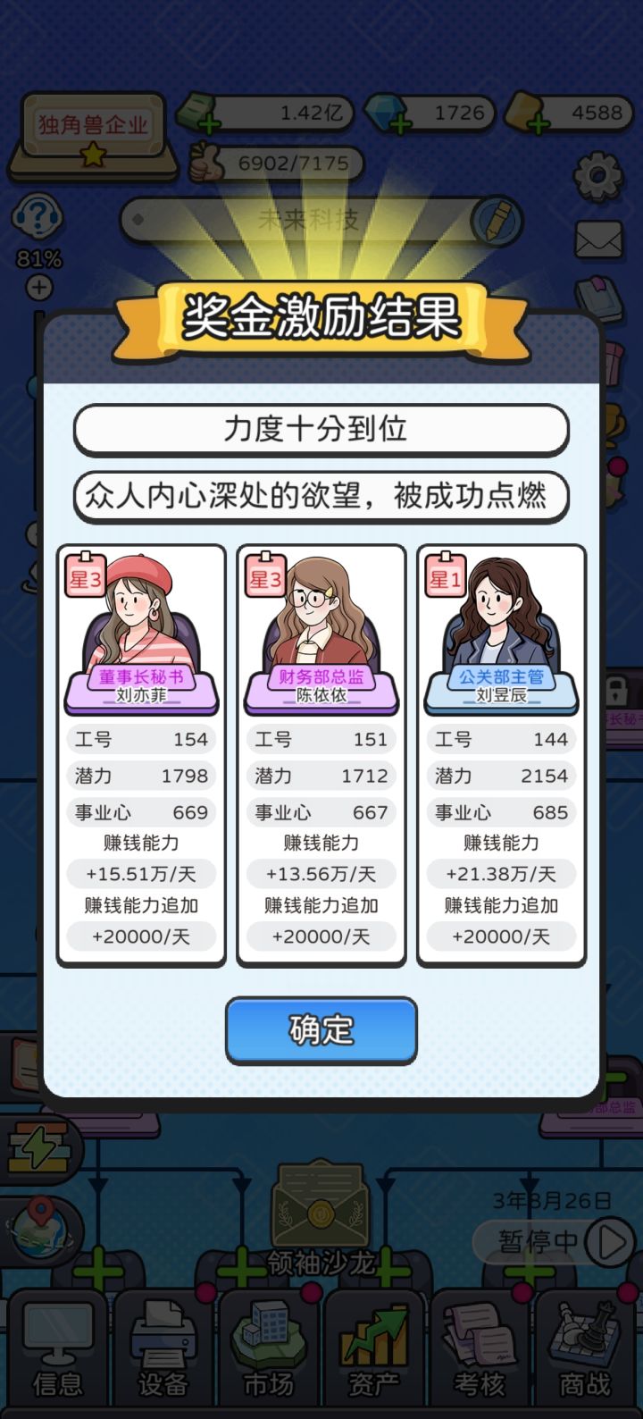 少养点人,我个人推荐就主要养业务部门下,人数到40左右就OK,前期还可以卡一下18人什么的,其它部门就出一个头头好了。金币只强化业务部,不用看广告,金币很快就完全没用了;钻石由于基本不招人,也不用刷属性,考核和市场开到能把手头的人全装下去就行,由于压了总人数,并不需要开太多,大部分时间刷商战就够用,偶尔只看看来救急;金卡成了全场MVP,多看,爱看,喂大毋须多宴。如果要对公司等级比较有追求,