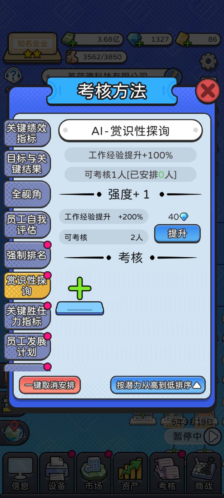 1.实在缺钻可以用时间大法,离线和七天签到可以反复领,几分钟就能刷几千钻,想慢慢体验游戏的可以不用。2.潜力不重要,加的赚钱能力是毛毛雨。事业心不重要,速刷星级以后不需要工作经验。学历不重要,因为没啥用。薪资不重要,不管多少工资公司都是赚钱的。设备市场考核都不重要。 职级⭐⭐⭐最重要,职级上去了,赚钱能力和四维都是指数级的涨。3.读书是涨四维最快的,职级越高,加的越多,星级员工读书看广告全红