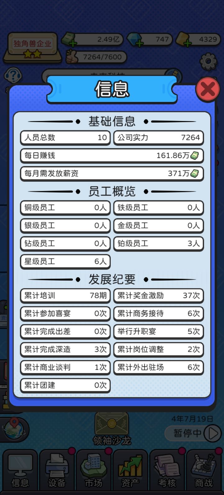 先介绍所有功能:商战⭐⭐⭐⭐⭐⭐两个400万就可以通关,其余一刀死抗下就行。伤害会有强制1血,所以理论上防御高的一个500万也能通关。算是前期灵魂,额外加两星。为啥到不了后期,源于这个游戏最恶心的机制【公司人数越多,游戏内每天时间对应现实时间时间越长,比如5人1s,10人1.4秒,15人1.8秒,20人2.2秒,30人2.6秒,50人3.7秒……以此类推,也就导致了这个游戏我百人百星就没玩了,时