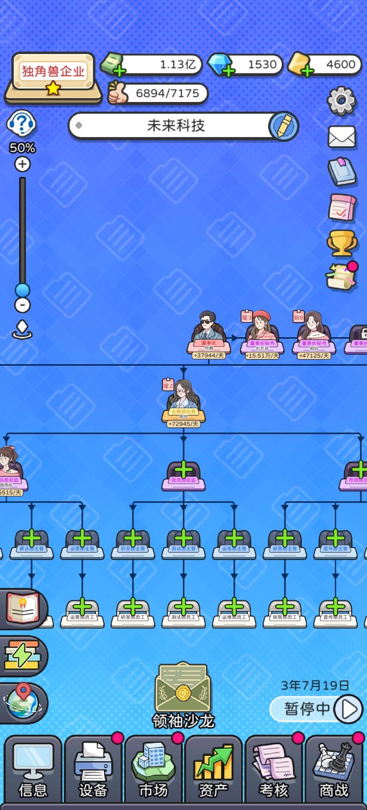 少养点人,我个人推荐就主要养业务部门下,人数到40左右就OK,前期还可以卡一下18人什么的,其它部门就出一个头头好了。金币只强化业务部,不用看广告,金币很快就完全没用了;钻石由于基本不招人,也不用刷属性,考核和市场开到能把手头的人全装下去就行,由于压了总人数,并不需要开太多,大部分时间刷商战就够用,偶尔只看看来救急;金卡成了全场MVP,多看,爱看,喂大毋须多宴。如果要对公司等级比较有追求,