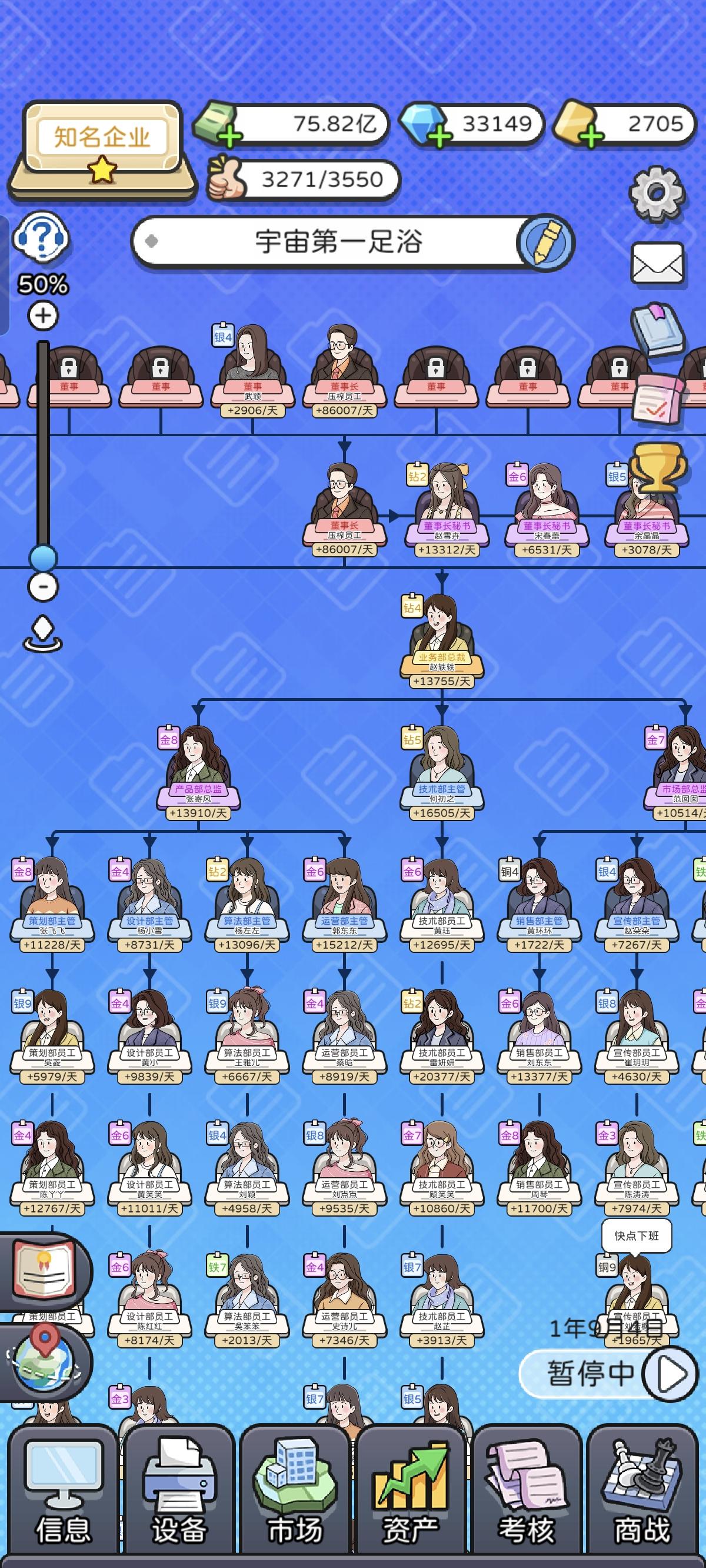 已达成商战通关、龙头企业五星游戏总体比较轻松,慢慢玩了几天~四维是关键!读书很重要!一开始走的广纳人才套路,随着人数增多,每一天的时间增长,如果读书广告少,员工四维增长慢,商战过不去。所以后期裁员,增加每位员工触发各类事件的概率,最终保持在40人左右。商战通关后可玩性降低,不感兴趣就没继续玩了。