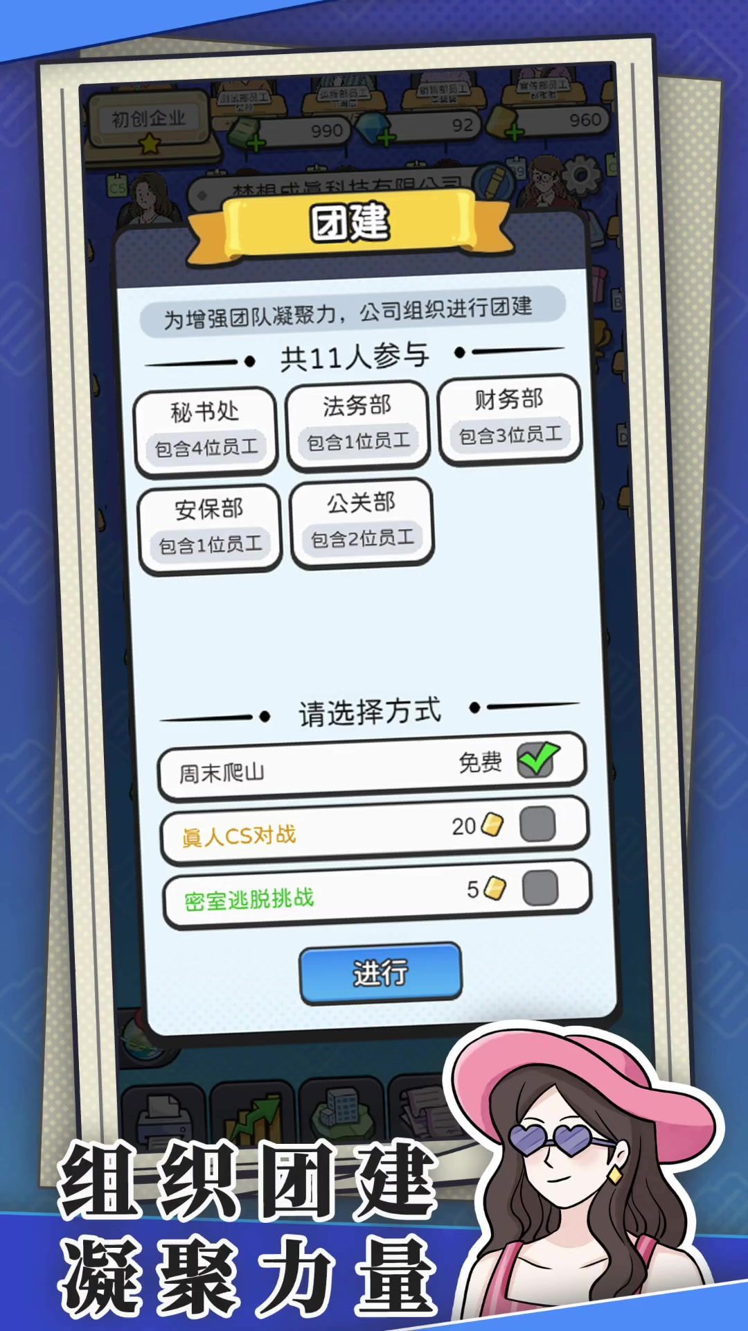 少养点人,我个人推荐就主要养业务部门下,人数到40左右就OK,前期还可以卡一下18人什么的,其它部门就出一个头头好了。金币只强化业务部,不用看广告,金币很快就完全没用了;钻石由于基本不招人,也不用刷属性,考核和市场开到能把手头的人全装下去就行,由于压了总人数,并不需要开太多,大部分时间刷商战就够用,偶尔只看看来救急;金卡成了全场MVP,多看,爱看,喂大毋须多宴。如果要对公司等级比较有追求,