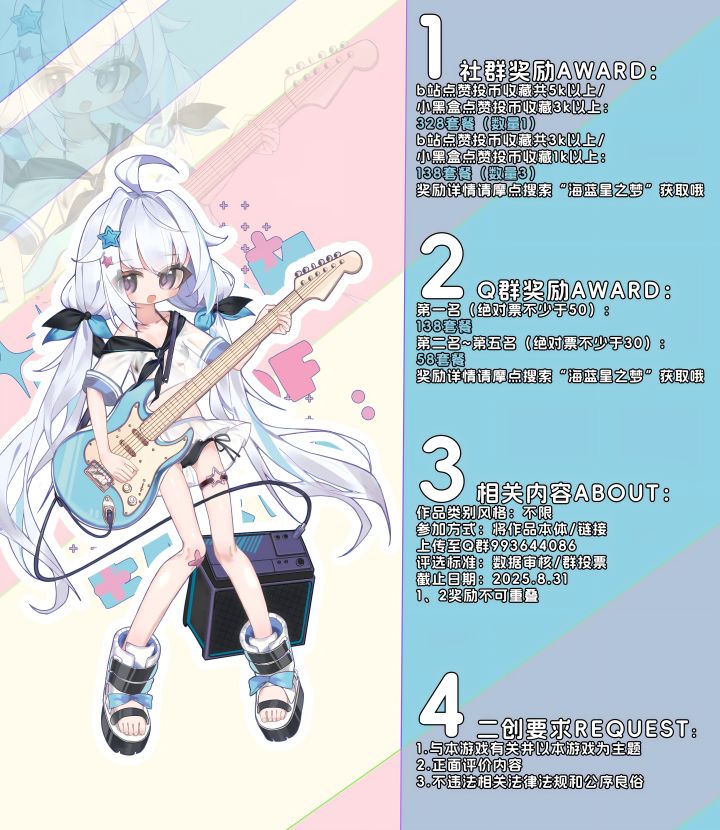 《海蓝星之梦》二创活动来啦!可能是最后一届(可能游戏发布后还会搞,先试运营)社群奖励 AWARD:- **b站#点赞投币收藏共5k以上 / 小黑盒点赞投币收藏3k以上**:328套餐(数量1) - **b站点赞投币收藏共3k以上 / 小黑盒点赞投币收藏k以上**:138套餐(数量3) *奖励详情请摩点搜索“海蓝星之梦”获取哦*Q群奖励 AWA