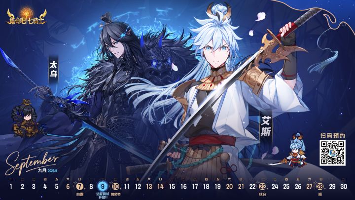 随着九月到来,空气中渐渐带出一丝凉意。在这个九月,《集合吧七骑士》「远征测试」即将开启带来“船新版本”和各位团长们见面啦——在《集合吧七骑士》游戏中,最值得推荐的当然就是帅气的四皇们了!!本期9月主题月历的封面人物我们迎来了太乌和艾斯两位帅气的剑术大师~九月是新学期开始的时间,悄悄告诉各位,在《七骑士》的故事中,太乌可是艾斯的师父哦!记得在即将开启的「远征测试」中将他们招募成伙