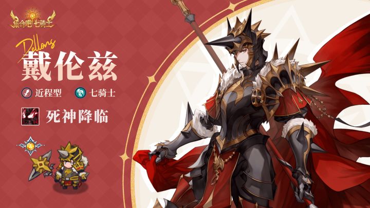 【英雄档案】「戴伦兹」----------------------------------✦名称:戴伦兹✦阵营:七骑士✦类型:近程型✦主动技能:「死神降临」----------------------------------「暗黑之墓的统治者。」「戴伦兹是有名的神秘黑骑士,又称死神,但是没人知道他来自哪里。」「他对力量和死亡怀有无限的渴望,因此渐渐与其他七骑士疏远。戴伦兹正身处