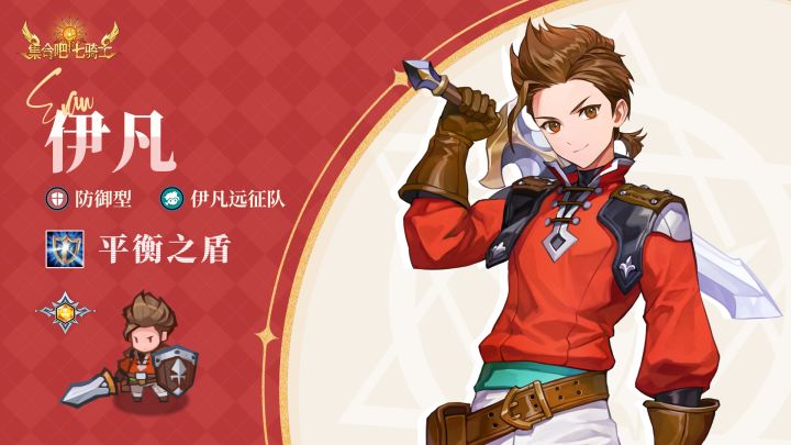【英雄档案】「伊凡」----------------------------------✦名称:伊凡✦阵营:伊凡远征队✦类型:防御型✦主动技能:「平衡之盾」----------------------------------「与七骑士一起阻止了盖亚走向毁灭的伊凡远征队的队长。」「他出生于泰拉王国,在为了成为像路迪一样的骑士而努力修炼的途中,为解开爷爷的遗物项链隐藏的秘密而开启了冒