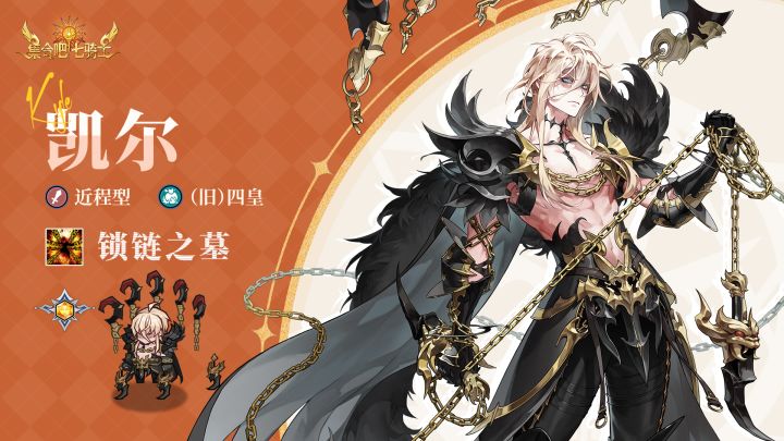 【英雄档案】「凯尔」----------------------------------✦名称:凯尔✦阵营:(旧)四皇✦类型:近程型✦主动技能:「锁链之墓」----------------------------------「出身或背景都不为人知的神秘刺客。」「他原本隶属影子军团,因为觉得没意思,就刺杀高层干部逃跑了。之后他按着某人给的名册逐个铲除有名人士,渐渐传出名声,被推举为