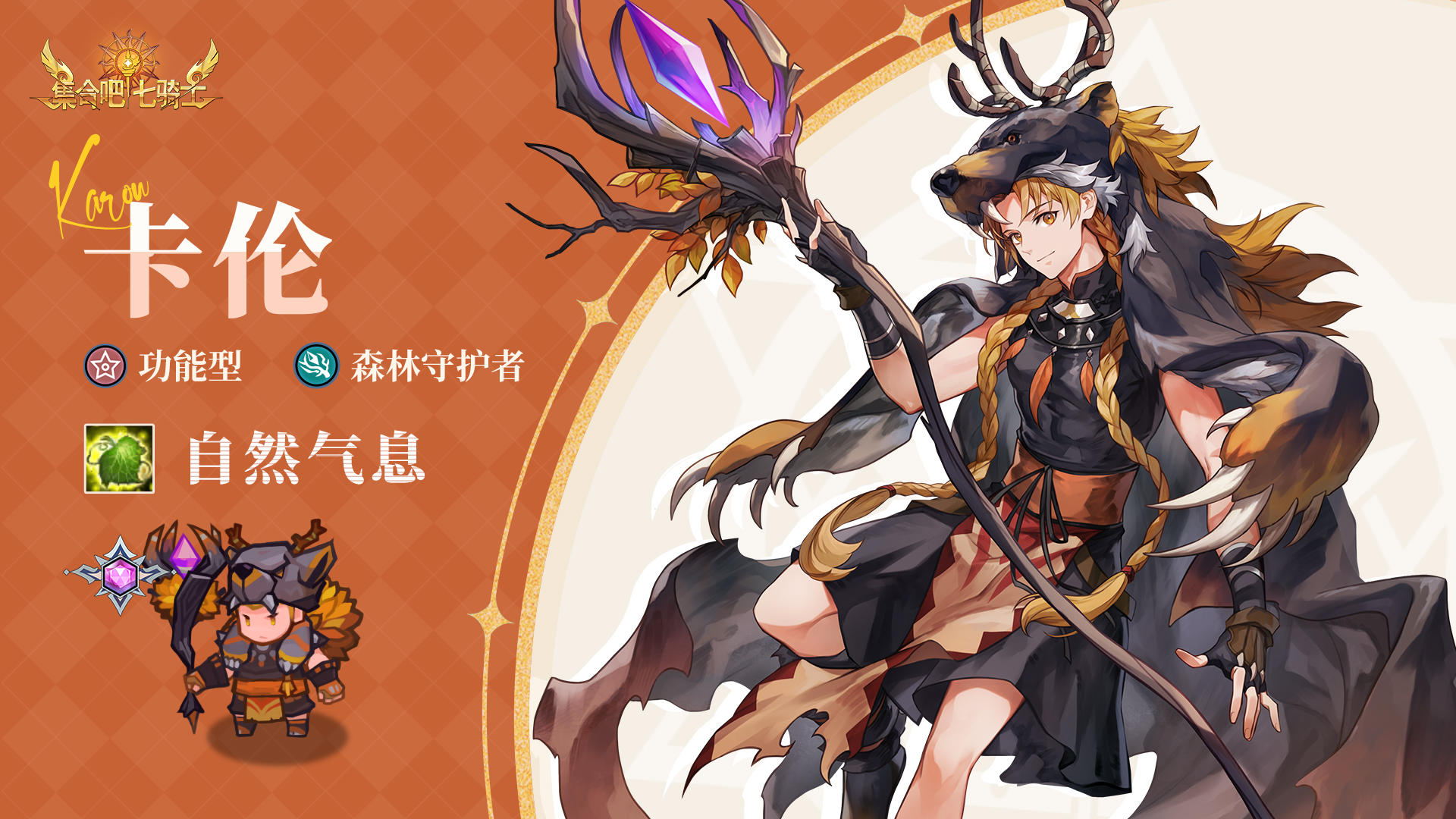 【英雄档案】「卡伦」----------------------------------✦名称:卡伦✦阵营:森林守护者✦类型:功能型✦主动技能:「自然气息」----------------------------------「在神秘森林里守护最大的神木一一母亲树的精灵使。由于年纪轻轻就过着远离文明的生活,所以对森林以外的情况一无所知。」「虽然他从不吝于向身处困境的人们伸出援手,却