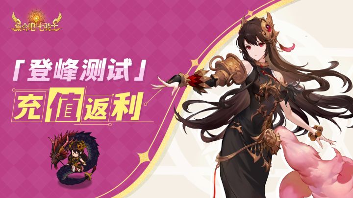 尊敬的骑士团团长:《集合吧七骑士》「登峰测试」将于2026年3月27日10:00准时开启。本次「登峰测试」为计费删档测试,测试期间开放充值功能,测试关服后账号数据将全部清空。各位团长在「登峰测试」期间所有充值付费金额,在《集合吧七骑士》公测正式上线后将根据以下规则获得充值返利,详情如下:✦「登峰测试」充值返利规则✦1、「登峰测试」期间,您在游戏内的充值总金额,将在游戏正式上线后,按照1元人